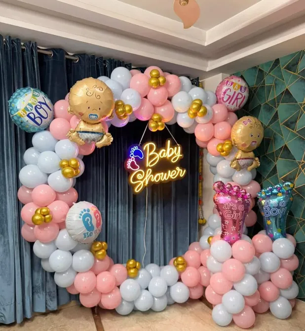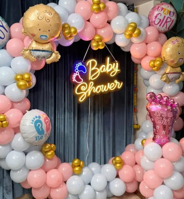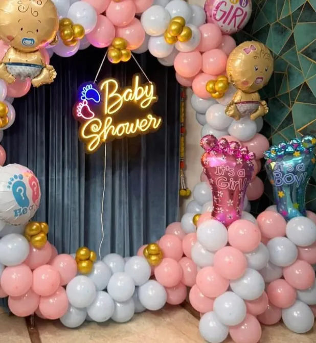 Topped with cute baby face balloons, gold balloon clusters, and adorable “It’s a Boy / It’s a Girl” themed props, the decor centers around a glowing “Baby Shower” neon sign – capturing hearts and creating the ultimate photo backdrop. Whether it’s a surprise party or a planned celebration, this setup adds a magical touch to your special moment.