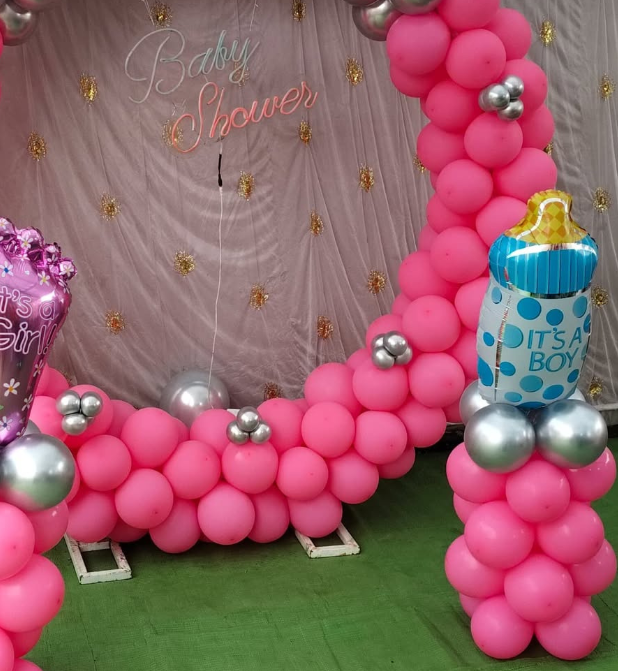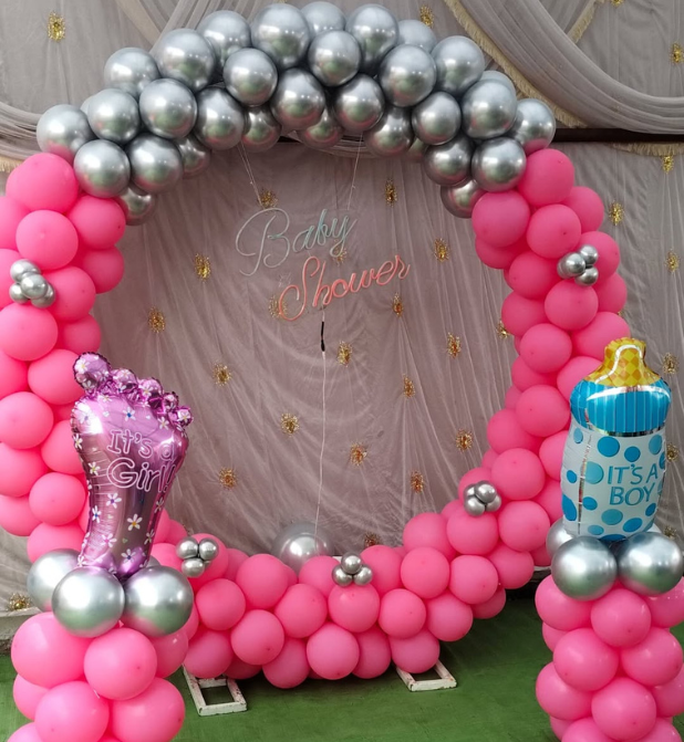 The highlight of this setup is the graceful round balloon arch crafted in premium pink and silver tones, complemented by cute foil props like the “It’s a Girl” footprint balloon and “It’s a Boy” baby bottle balloon—offering a charming gender-neutral yet festive vibe. The backdrop is completed with a delicate “Baby Shower” signage that adds a touch of elegance and celebration to your venue.
