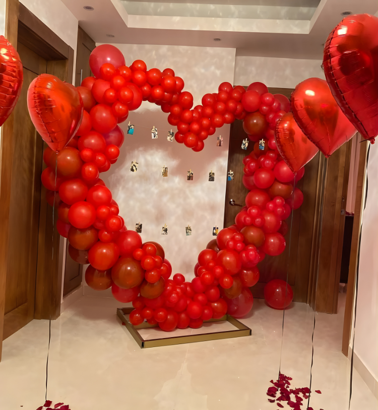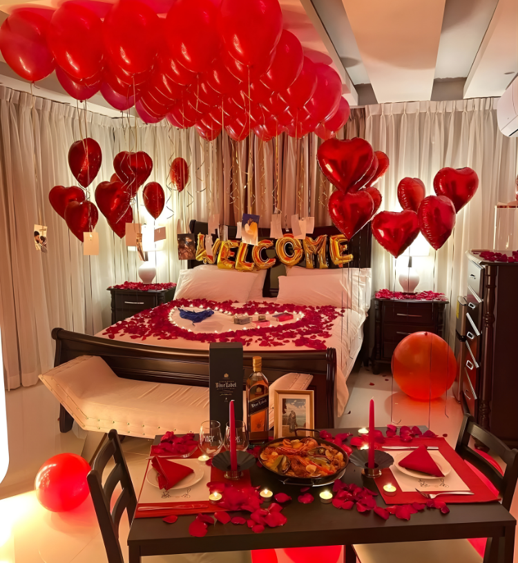 Give your partner the most memorable welcome with this Luxury Romantic Welcome Room Decoration, designed to beautifully transform a bedroom into a dreamy celebration space. This premium décor features a stunning balloon-filled ceiling, red heart foil balloons and a warm romantic ambiance that makes the moment truly magical.