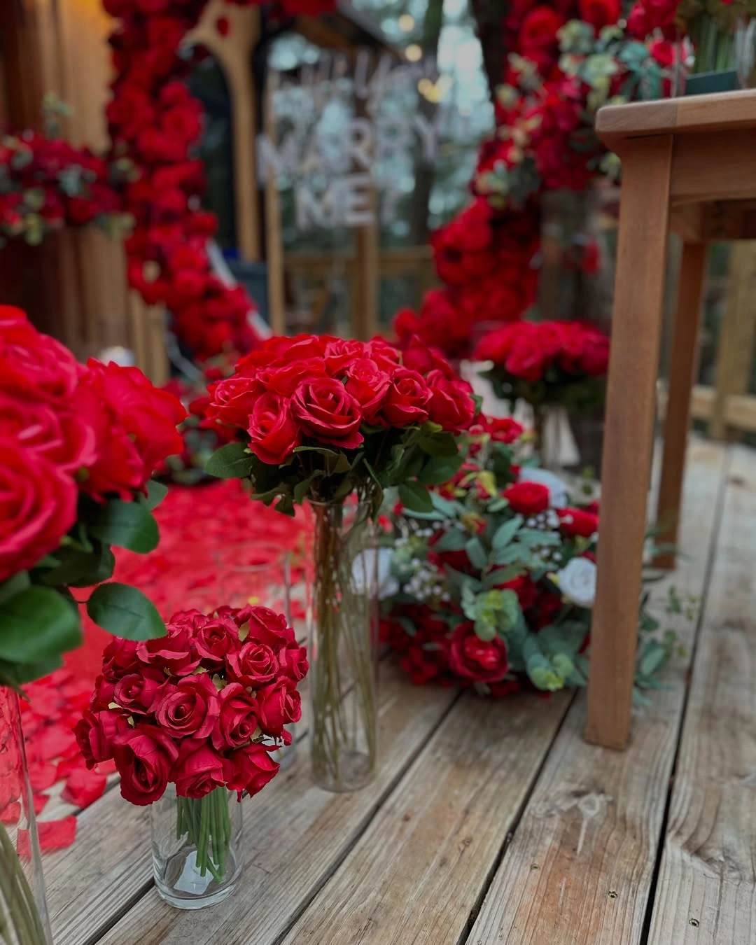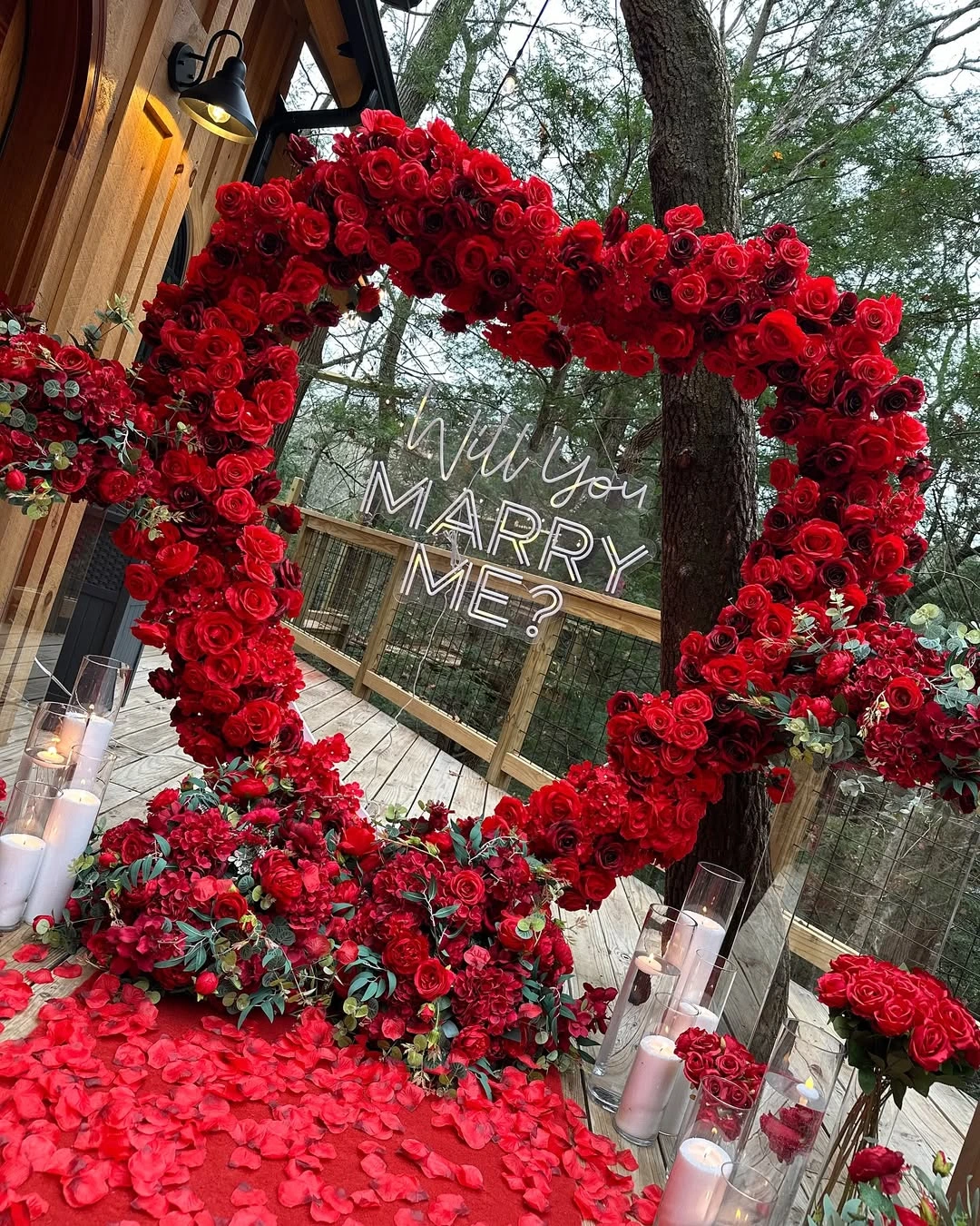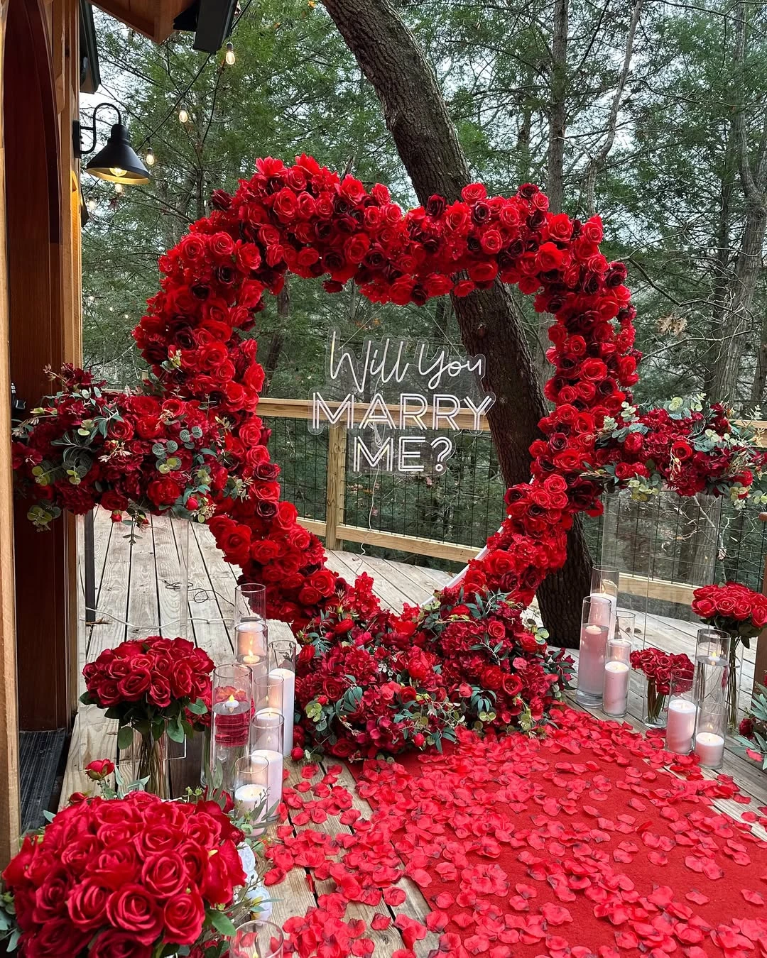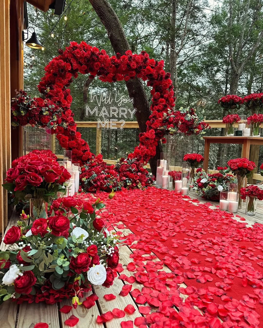 Immerse yourself in a world of timeless romance with our Crimson Vow – Red Rose Proposal Setup, a regal expression of love designed for unforgettable moments. Set amidst the tranquility of nature, this elevated wooden-deck setting transforms into a royal red dream — adorned with thousands of rich crimson rose petals, premium floral clusters, and a showstopping heart-shaped arch made entirely from fresh velvety red roses. At the center glows a “Will You Marry Me?” neon sign that captures the very essence of the moment — elegant, bold, and passionate. Surrounded by candlelit warmth, gentle forest views, and fragrant blooms, this setup isn’t just for asking a question — it’s for making a declaration of forever.