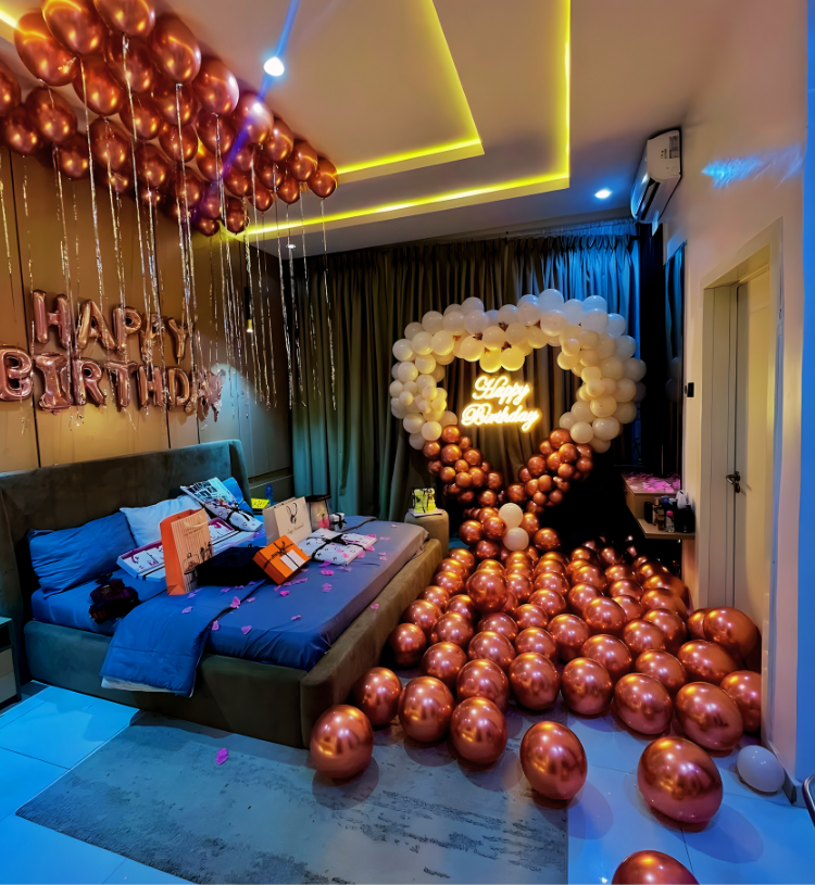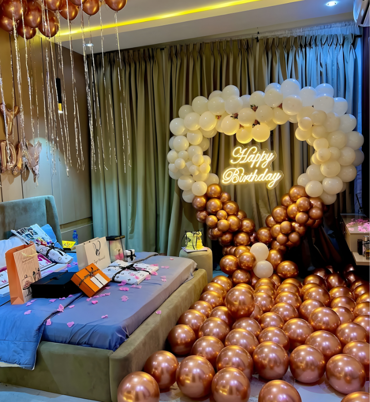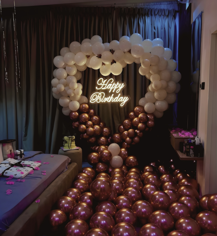The glamorous chrome balloons, romantic heart-shaped backdrop, birthday neon light and floor styling create a dramatic celebration vibe that feels premium, stylish and Instagram-perfect — ensuring unforgettable memories and beautiful pictures.