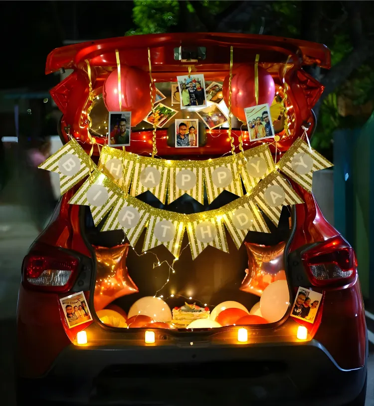 Turn an ordinary drive into an extraordinary lifetime memory with the Drive & Surprise Midnight Trunk Celebration Setup. Designed especially for romantic surprises, birthday celebrations and unforgettable special moments, this decor beautifully transforms the car trunk into a mini celebration zone complete with lights, balloons, photos, décor styling and warm birthday ambience.