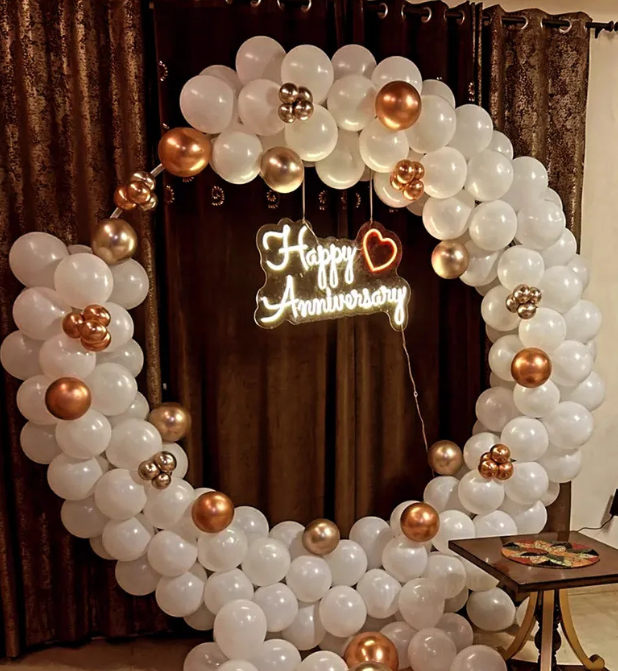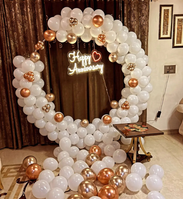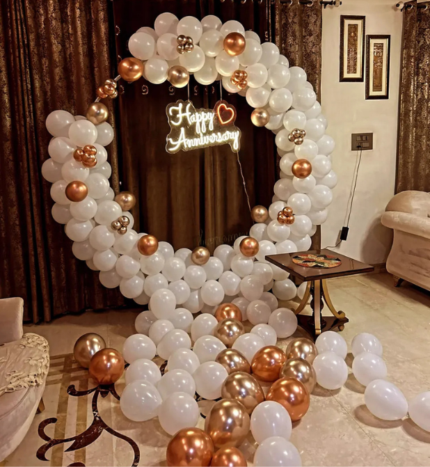 This setup features a grand circular balloon arch crafted with white, rose gold, and golden chrome balloons, complemented by a glowing “Happy Anniversary” LED neon sign with dual heart motifs. The soft tones create a calming ambiance, while the floor balloon spread adds charm and a cozy feel — perfect for photos, dinner parties, and couple moments.