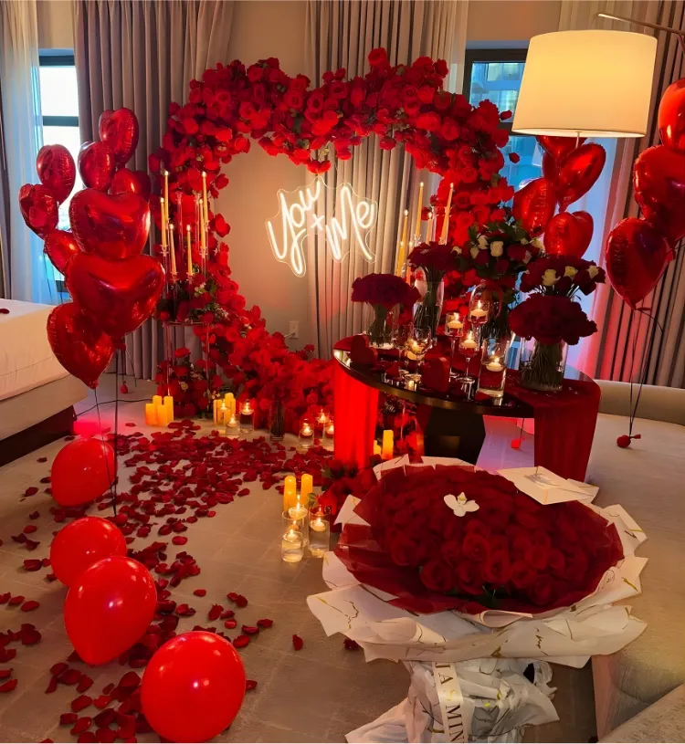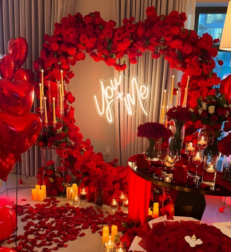 Celebrate love in the most breathtaking and cinematic way with the Eternal Scarlet Romance Signature Setup – a luxurious room transformation designed to express passion, commitment and pure romance. Featuring a grand heart-shaped red floral backdrop with elegant candles, glowing neon “You & Me” light, rose petal pathway, premium décor styling and romantic ambience lighting, this setup turns any room into a dreamy, emotion-filled paradise.