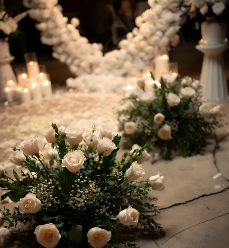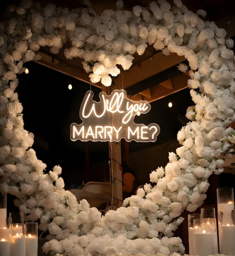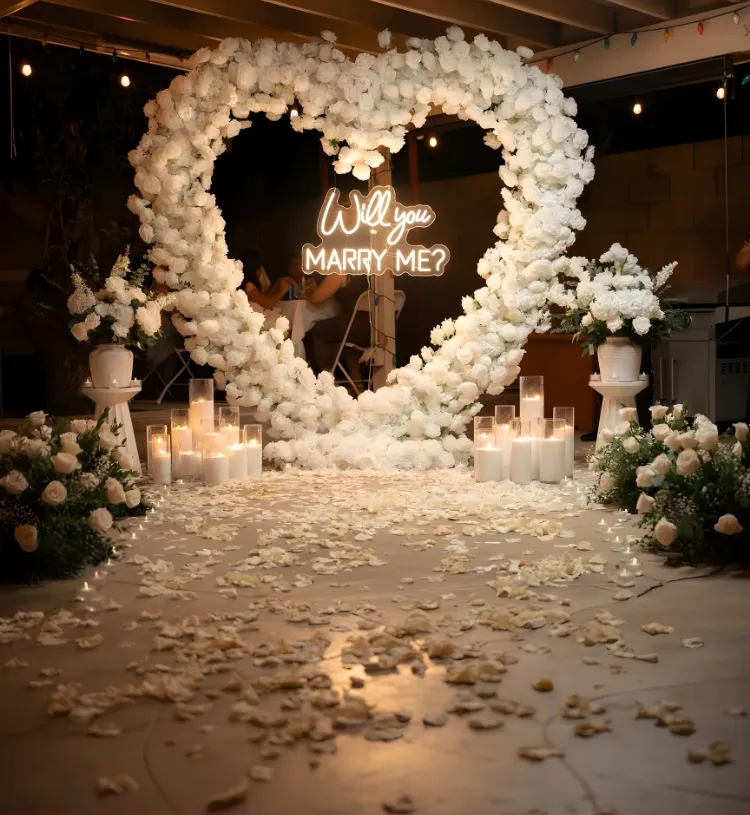 Make your proposal moment feel like a fairytale with the Eternal White Proposal – Royal Floral Heart Setup, a breathtaking luxury decor designed to create the most magical “Will You Marry Me?” experience. Featuring a grand life-size floral white heart backdrop, elegant pathway styling, premium white florals, glowing candle lights and a stunning proposal neon sign, this setup ensures an unforgettable and picture-perfect proposal moment.