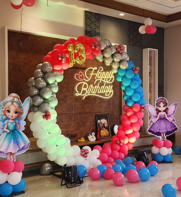 The decor features a majestic rainbow-style balloon arch blending red, pink, blue, white, and metallic silver tones. A glowing “Happy Birthday” neon sign with hearts, cheerful number 13 foil balloon, and life-size fairy and princess cutouts create a picture-perfect fantasy zone for your little star and her guests.