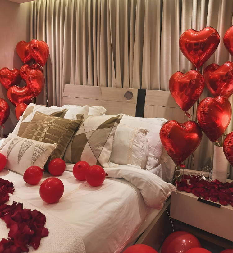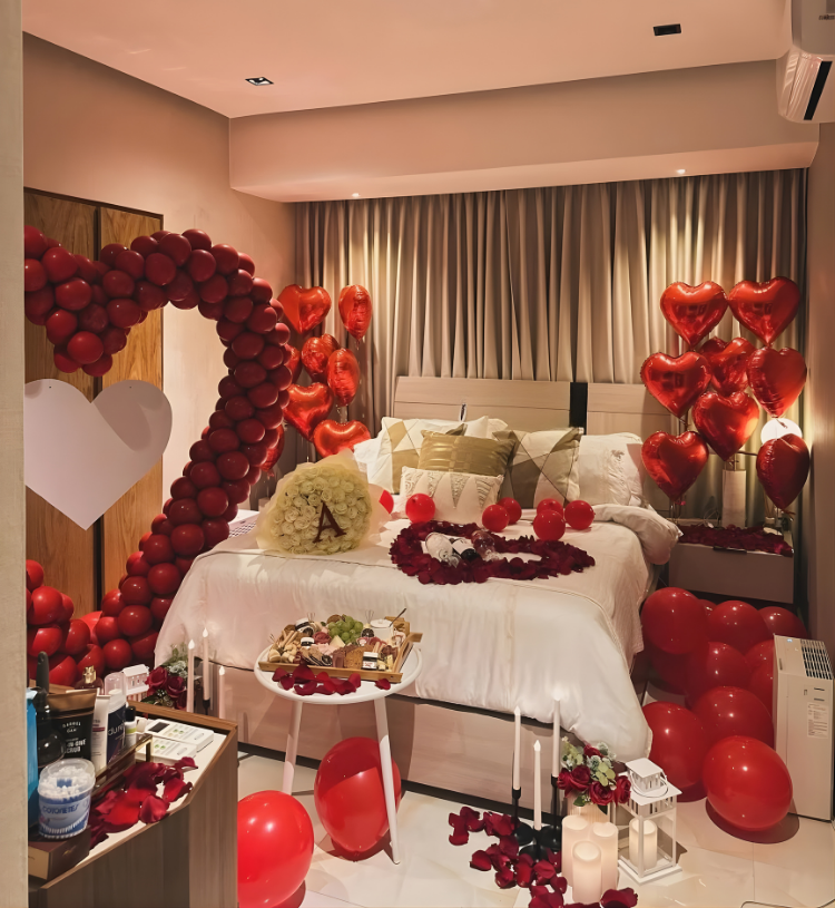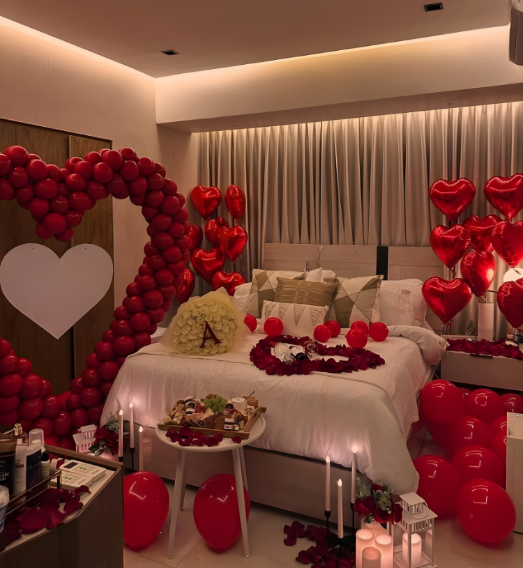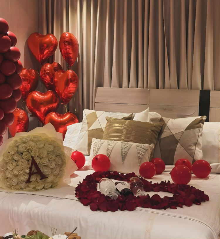 Fill the room with love, warmth and luxury romance with the Heart Aura Royal Romance Room Setup – a breathtaking celebration decor crafted to turn intimate moments into unforgettable memories. Featuring a grand heart balloon arch, premium heart foil balloons, rose petals styling, candles, personal touches and elegant romantic ambience décor, this setup creates a dreamy world of love and emotions.