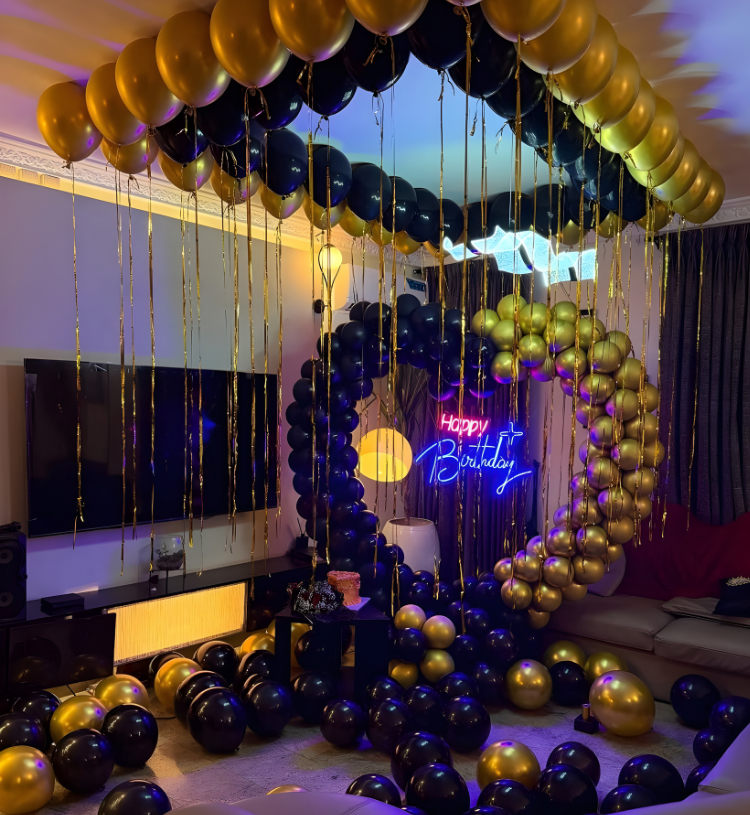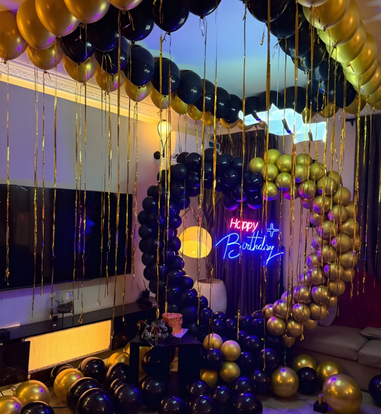 This décor is perfect for those who love sophisticated celebrations and premium party aesthetics. Whether it’s a romantic birthday surprise, luxury home celebration or elite private party, this setup delivers an unforgettable visual impact and Instagram-perfect birthday photos.