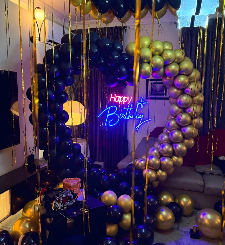 Transform any celebration night into a grand, dramatic and ultra-luxury experience with the Midnight Royale Luxe Birthday Decor Experience. Designed in a bold and classy Black & Gold luxury theme, this breathtaking birthday setup features premium balloon styling, heart backdrop arch, elegant floating ceiling balloons with golden ribbons, floor balloons and a glowing Happy Birthday neon – creating a powerful, glamorous and cinematic celebration ambience.