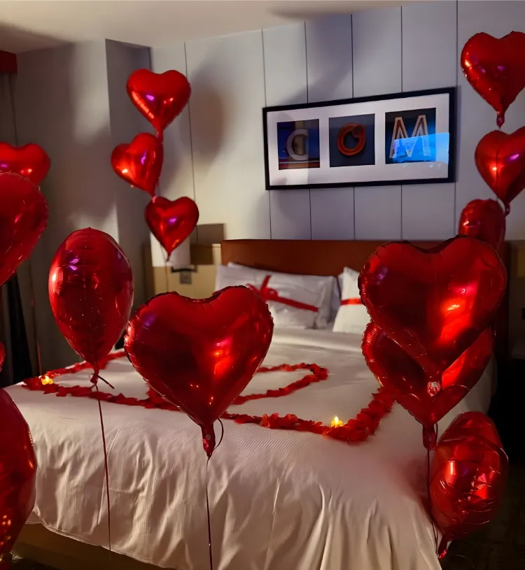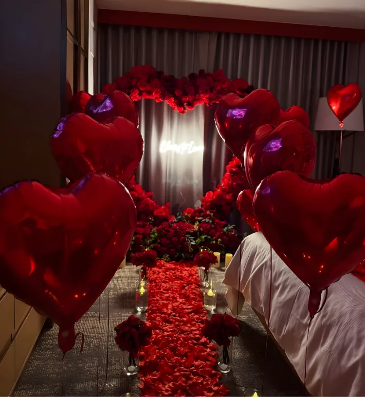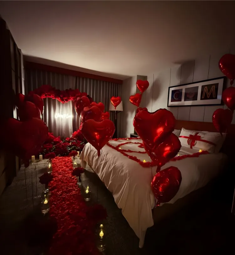 Turn your special night into an unforgettable, cinematic love experience with the Midnight Scarlet Heart Symphony Setup. Designed with deep red romance, warmth and luxury, this breathtaking room decor features a glowing rose pathway, floating heart balloons, candle-lit ambience and a beautifully styled romantic bed décor that instantly fills the room with love and magic.