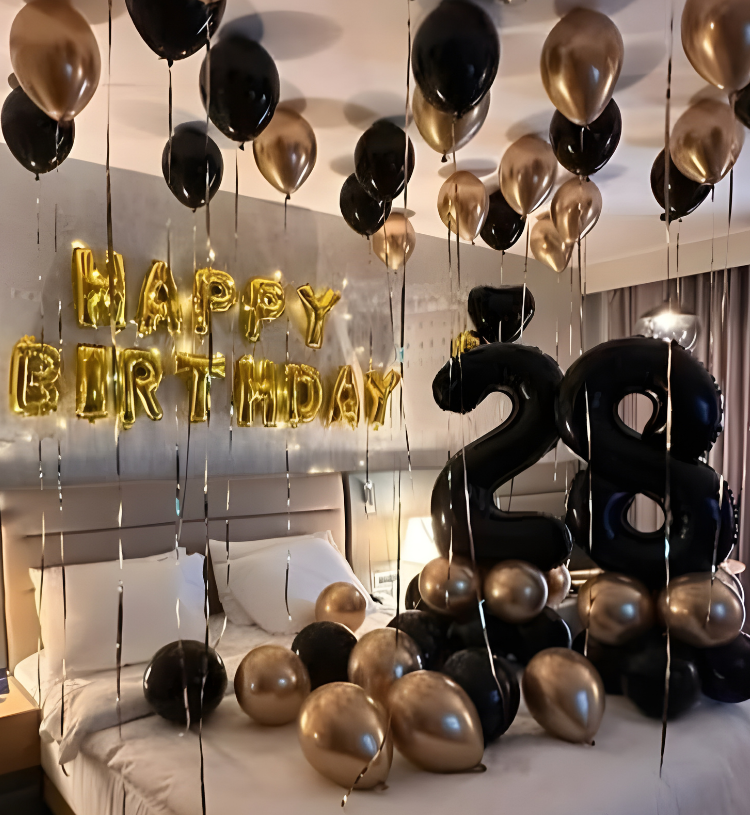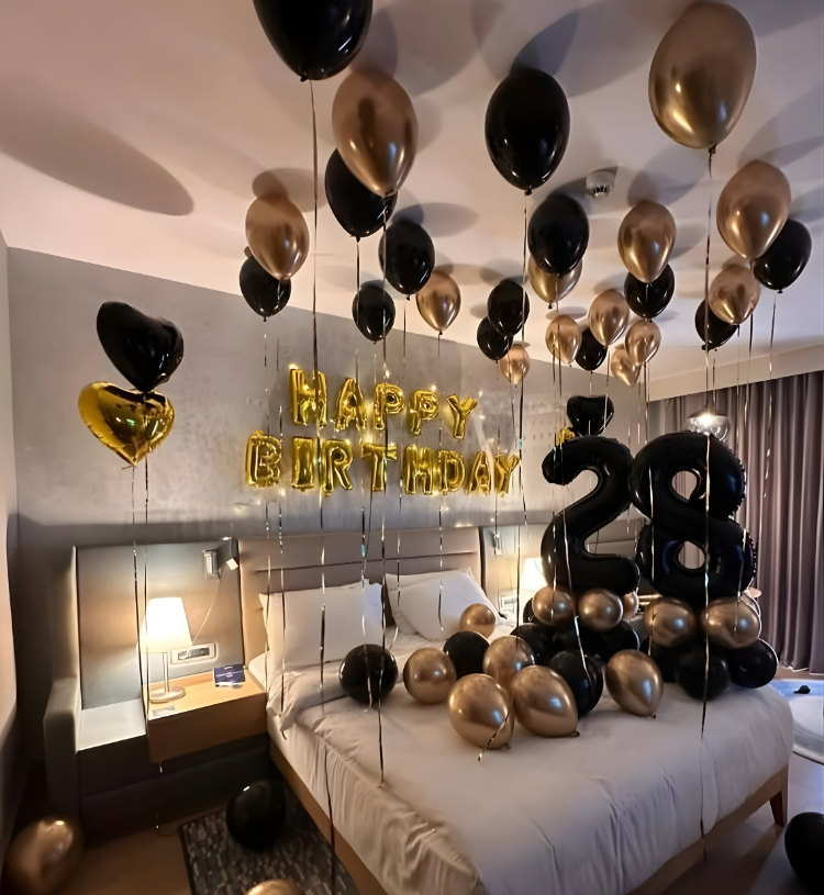 Celebrate birthdays in the most royal and majestic style with our Royal Black & Gold Luxury Birthday Room Decoration. Designed to create a classy, premium, and picture-perfect celebration experience, this decor blends sophistication with festive glamour. The room is beautifully styled with floating black and golden helium balloons, luxe ceiling decor, elegant balloon bunches, and highlight birthday foil balloons, creating a truly grand atmosphere.