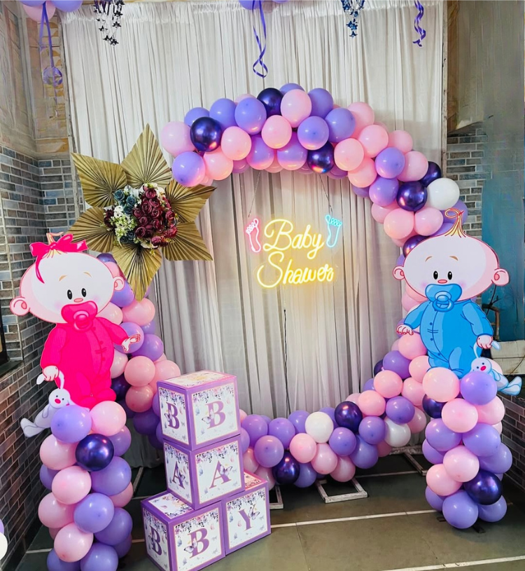 The adorable Baby Boy & Baby Girl standees instantly add charm and fun to the décor, making it perfect for photos, reels and unforgettable memories. A glowing “Baby Shower” neon light highlights the backdrop and adds a luxurious modern touch, while the stylish BABY cube boxes and premium floral décor enhance the overall beauty of your celebration space. Ideal for home celebrations, banquet halls, cafes, rooftops or indoor venues, this setup promises a warm, picture-perfect and emotionally beautiful baby shower experience that your guests will adore.