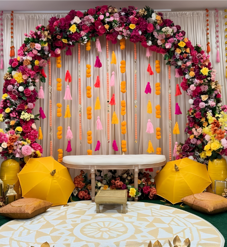 Bring charm, culture and royal celebration vibes to your Haldi or Mehndi ceremony with the Royal SundarSaaz Haldi Signature Setup. Designed with vibrant marigold tones, luxurious floral arch styling, traditional props, colorful tassels and elegant décor detailing, this setup beautifully blends tradition with modern luxury. The stunning floral half-ring backdrop, yellow umbrellas, plush cushions and premium ethnic accents create a picture-perfect stage that makes rituals feel grand, joyful and truly memorable.