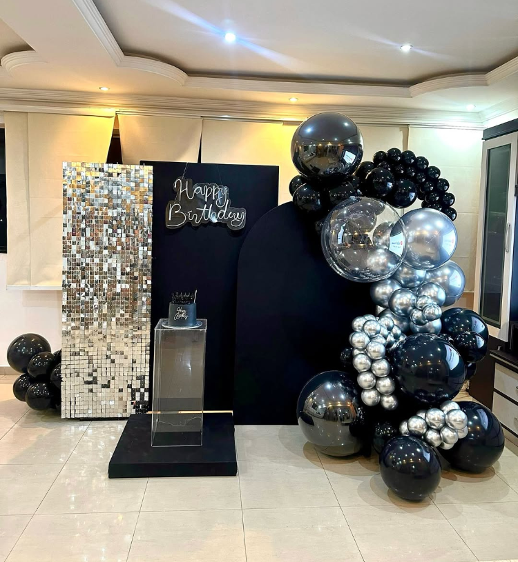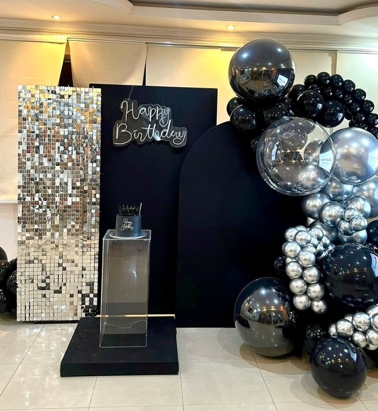 Create a glamorous, high-end birthday celebration look with this Ultra Luxury Black & Silver Birthday Setup, designed especially for milestone birthdays and premium parties. The stunning shimmer wall paired with a sleek black panel backdrop and a stylish balloon garland in glossy black and chrome silver tones makes the décor look modern, classy and picture-perfect. The elegant pedestal cake stand and glowing Happy Birthday neon add that luxury celebration vibe every guest will love.