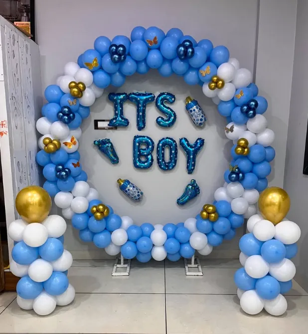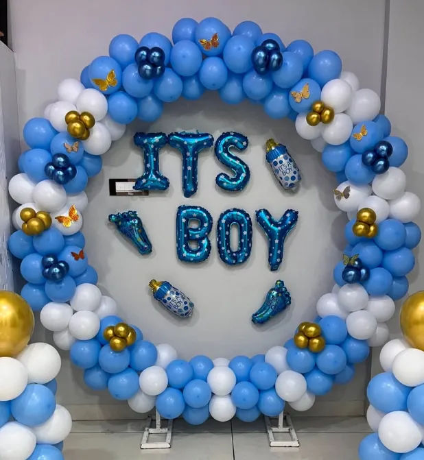 Welcome your little prince with this heart-melting “It’s a Boy” Baby Shower & Naming Ceremony Decor that adds joy, charm, and cuteness to your special day! Designed in soft baby blue, white, and golden hues, this balloon ring arch makes a perfect backdrop for baby showers, hospital homecomings, naming ceremonies, or gender reveal parties.